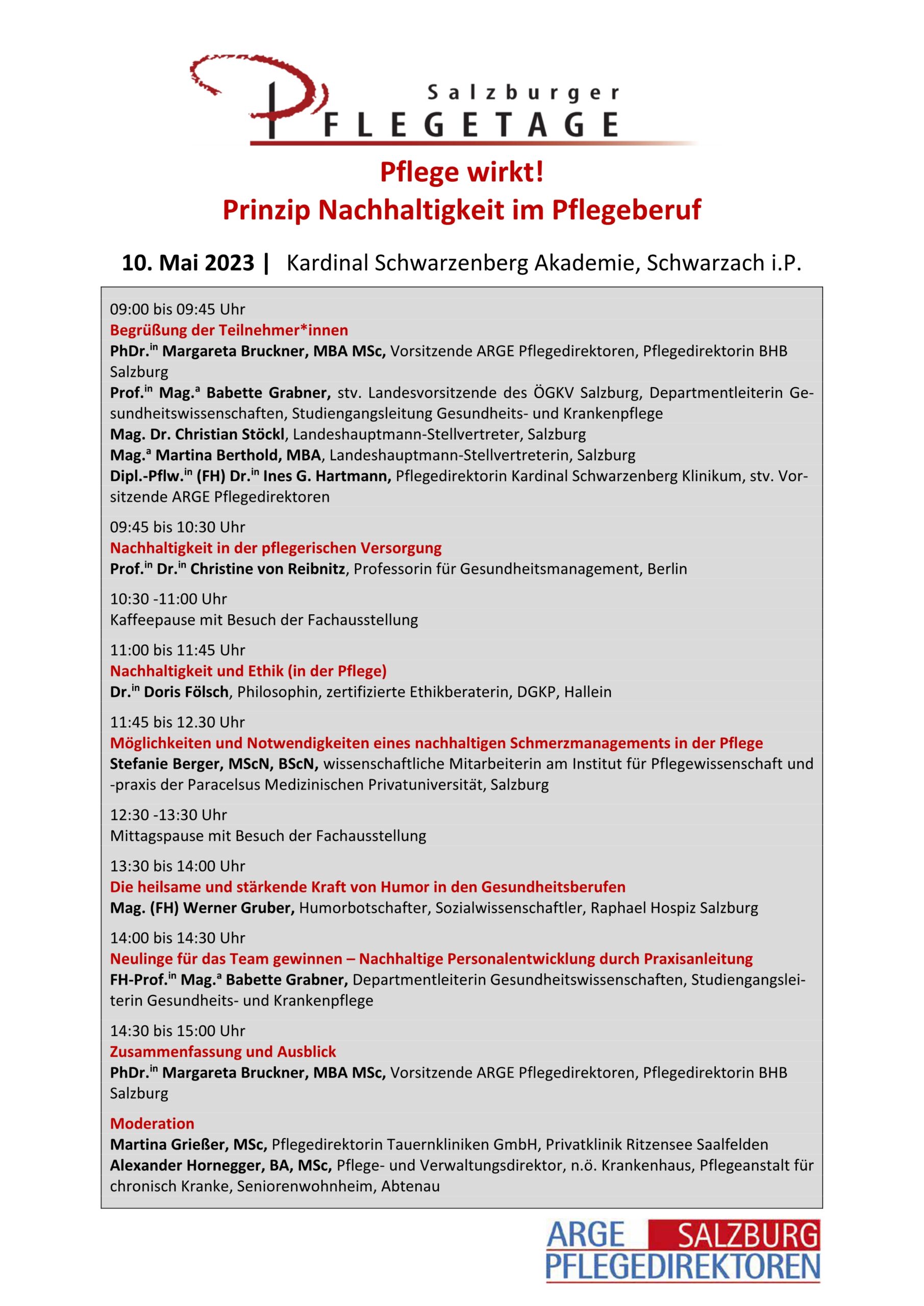 Am Mittwoch, 10. Mai 2023, verwandelte sich die Kardinal-Schwarzenberg-Akademie in Schwarzach im Pongau in einen Treffpunkt für Pflegeexpertinnen: Die Pflegefachtagung der Salzburger Pflegetage stand heuer unter dem Leitgedanken „Nachhaltigkeit im Pflegeberuf“.